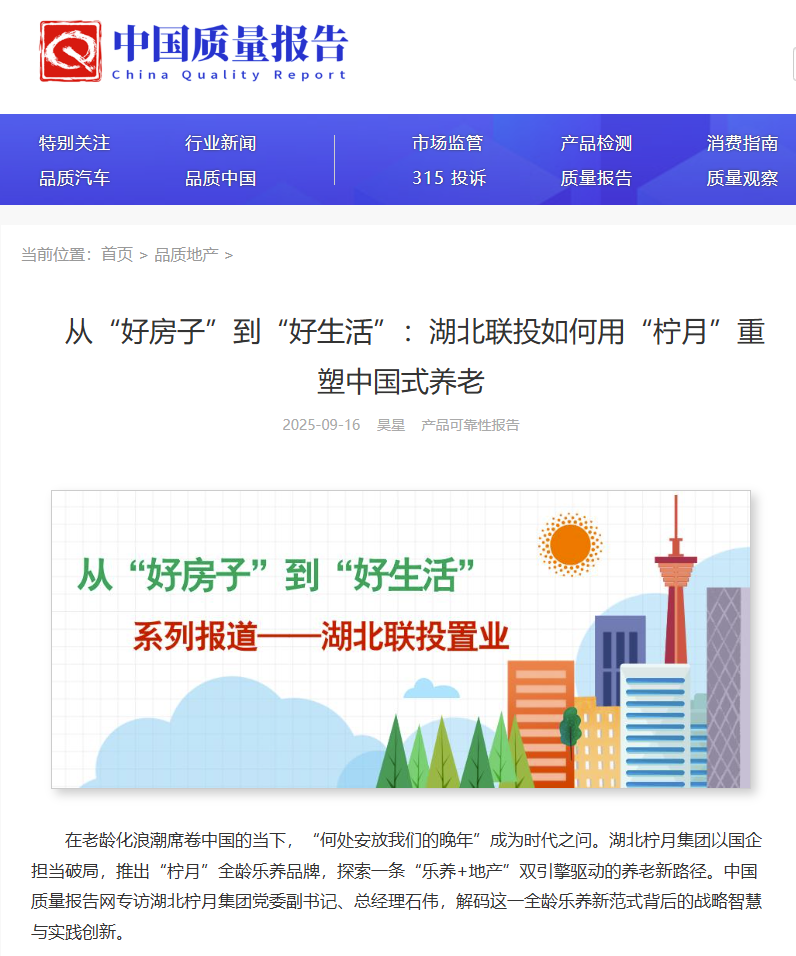 2025年,“好房子”首次被写入政府工作报道,银发经济成为战略发展重点。作为“城市更新全龄乐养生活营造商”,湖北柠月集团始终立足“好房子+好服务”,着力打造兼具适老居住功能与多元乐养体验的全龄乐养新生态。近日,中国质量报告网官方报道《从“好房子”到“好生活”:太阳集团网址如何用“柠月”重塑中国式养老》,讲述湖北柠月集团如何加速转型,通过“乐养+地产”的双引擎驱动模式,创新打造 “柠月” 全龄乐养品牌,为中国现代化养老提供新范式,助推银发经济高质量发展。以下为报道转载原文:
