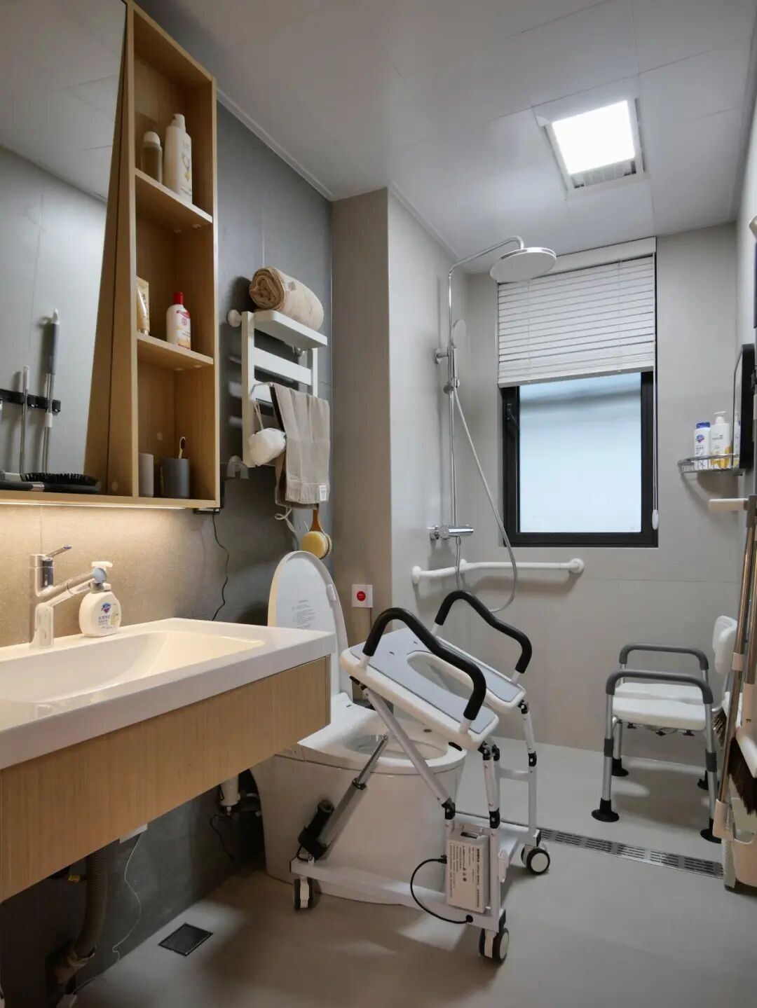 卫生间:L型扶手、淋浴凳与轮椅回转空间形成“安全三角”。