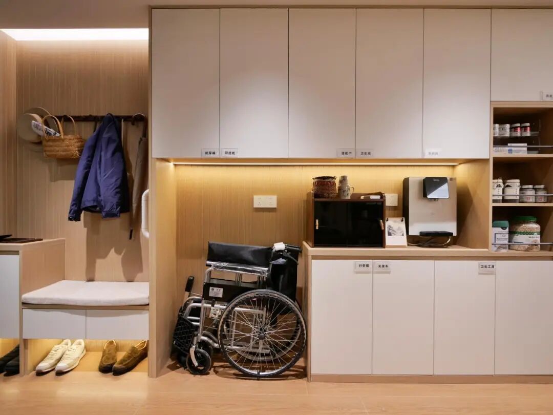 玄关:带扶手换鞋凳与中部镂空柜体,让弯腰风险归零。