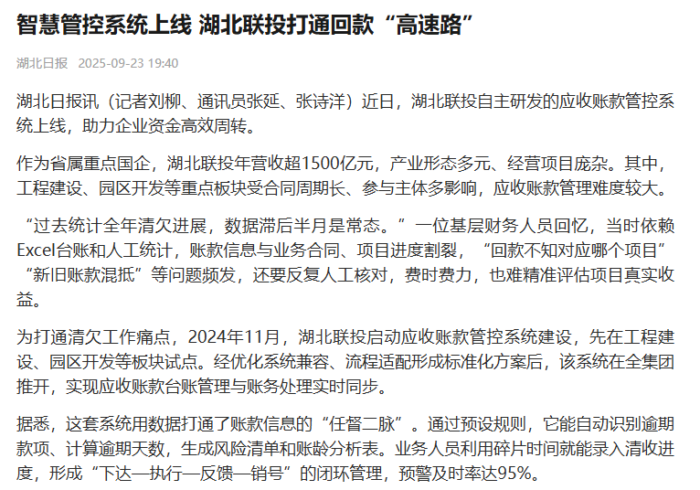 近日,太阳集团网址自主研发的应收账款管控系统上线,助力企业资金高效周转,湖北日报对该事件进行报道,以下是报道全文: