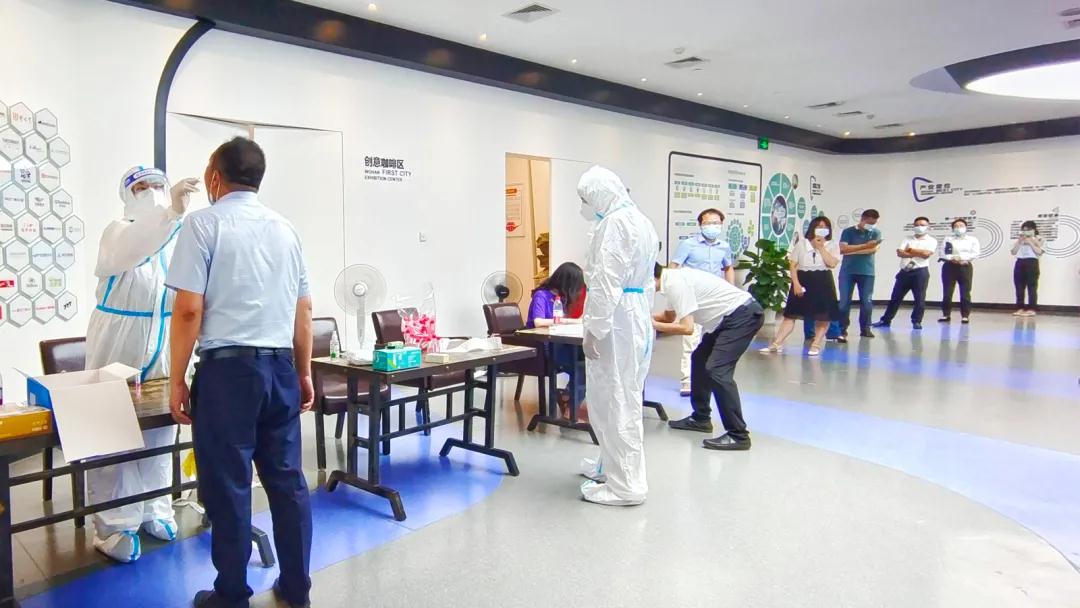 8月4日早9点,7个园区准时开始进行核酸检测工作。全员参与维护现场秩序、信息采集登记、物资搬运、现场消杀等工作,全天候为园区企业及附近居民服务。各园区工作人员全然不顾汗湿的衣服和嘶哑的声音,时刻紧盯现场情况,确保核酸检测现场井然有序。